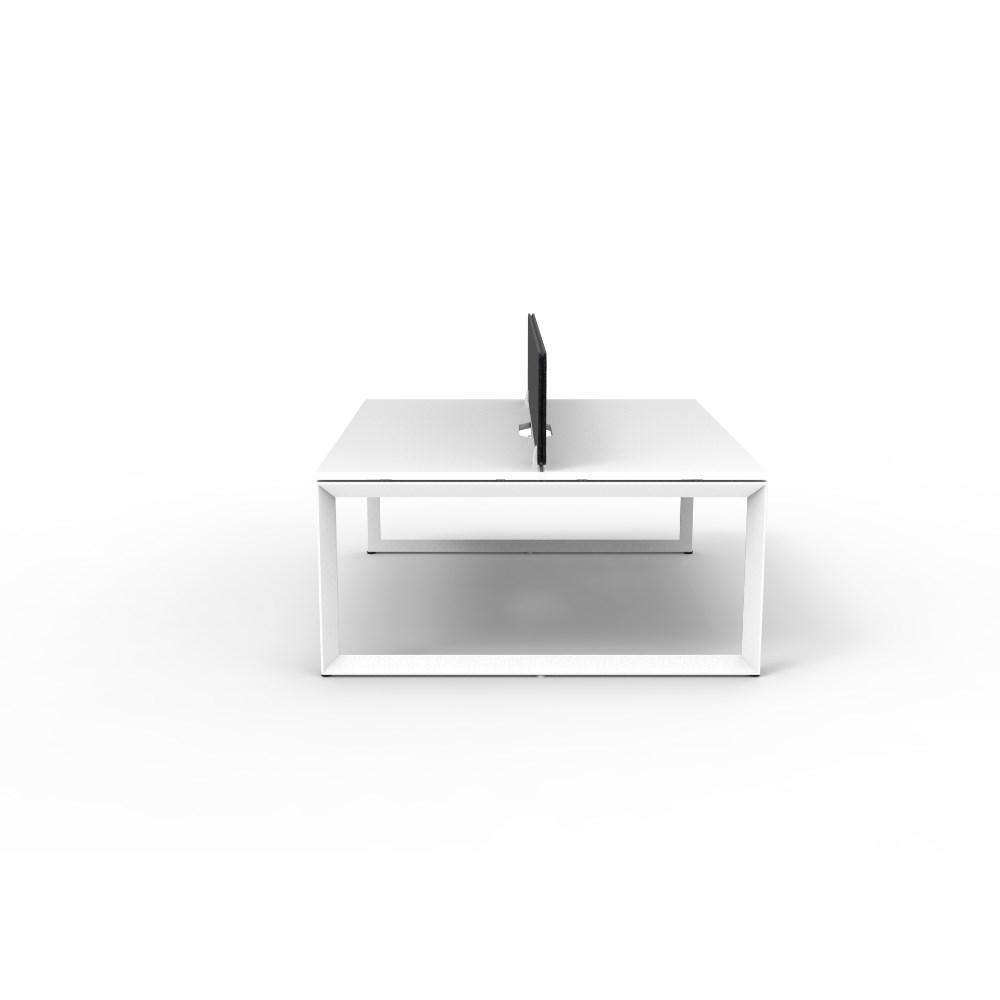 2 person double sided workstation with White top and White Satin frame, Black Eco screen.