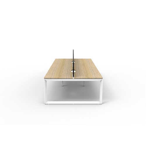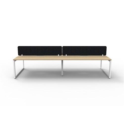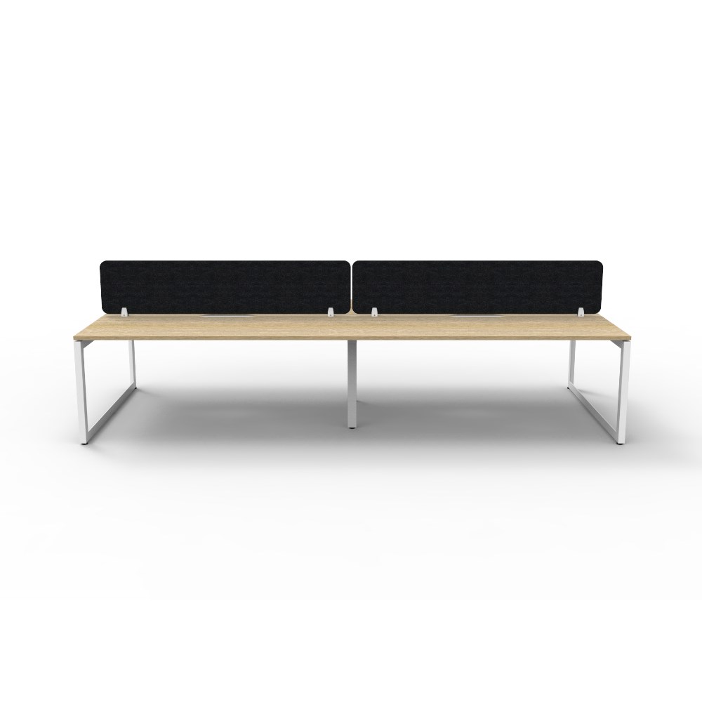 4 person double sided workstation with Natural Oak top and White Satin frame, Black Eco screen.