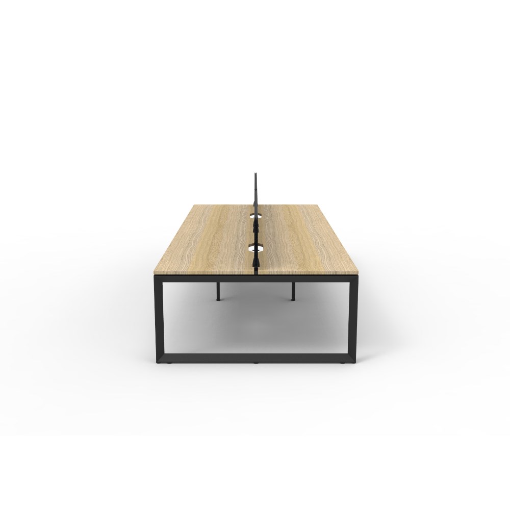 4 person double sided workstation with Natural Oak top and Black Satin frame, Black Eco screen.