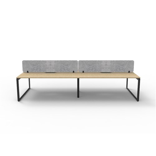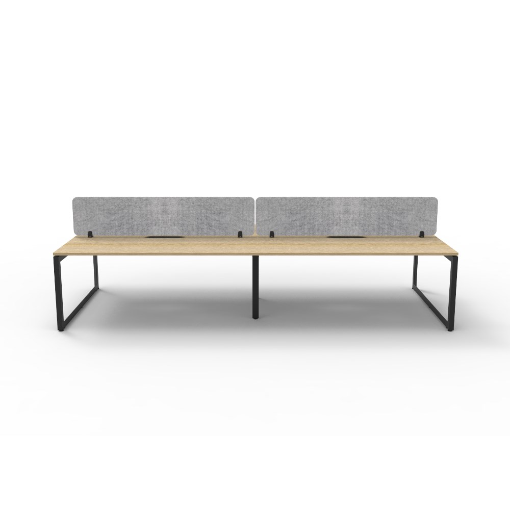 4 person double sided workstation with Natural Oak top and Black Satin frame, Grey Eco screen.
