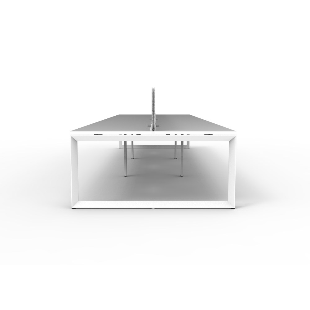 6 person double sided workstation with White top and White Satin frame, Grey Eco screen.