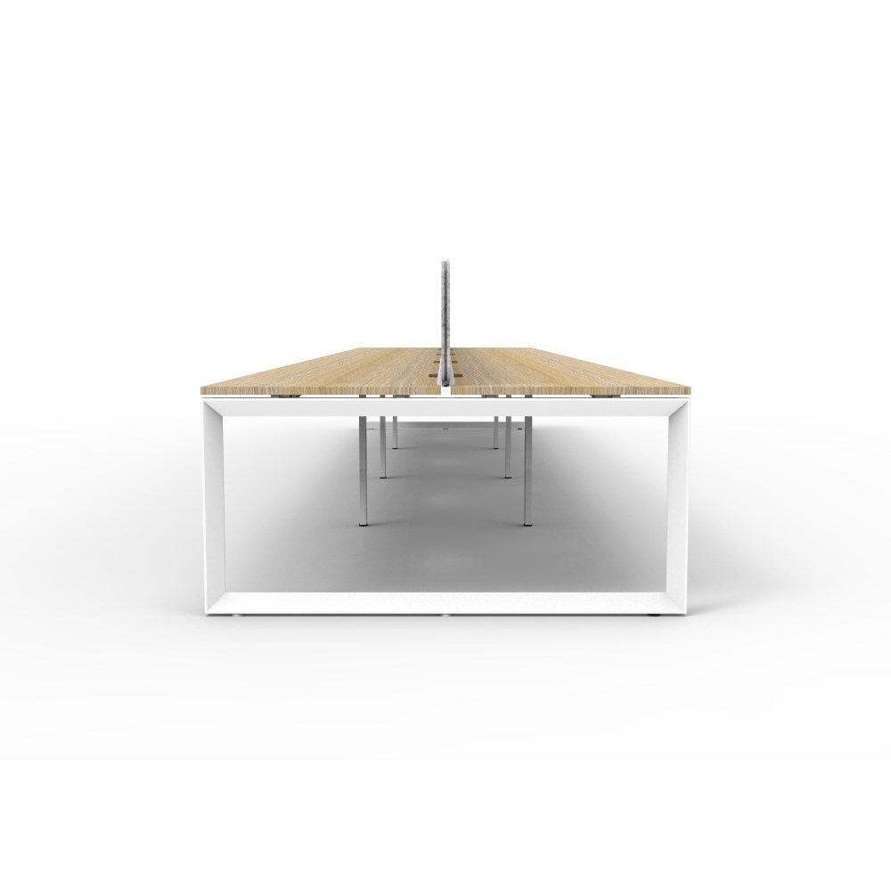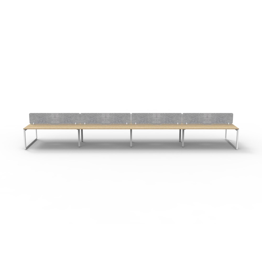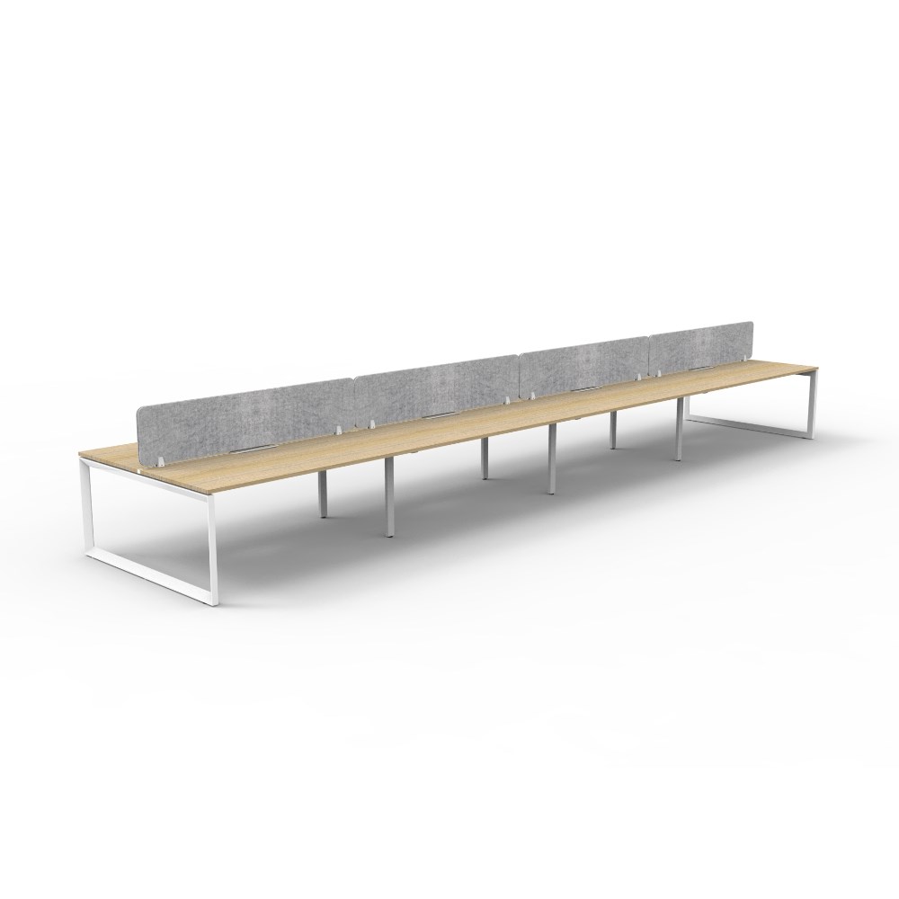 8 person double sided workstation with Natural Oak top and White Satin frame, Grey Eco screen.