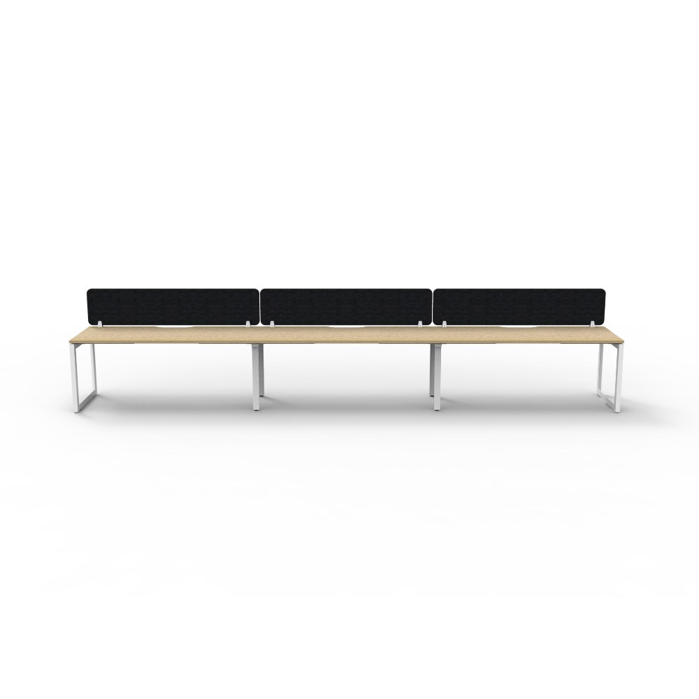 3 person single sided workstation with Natural Oak top and White Satin frame, Black Eco screen.