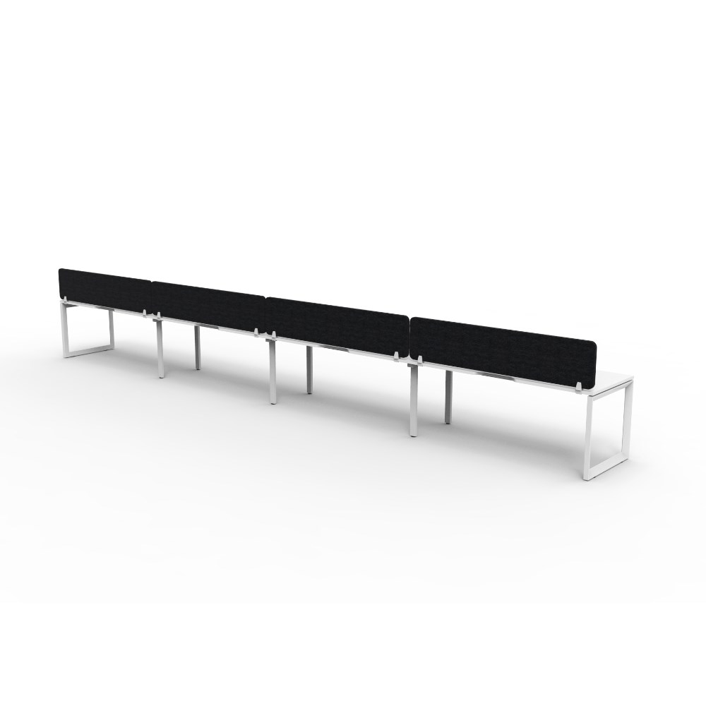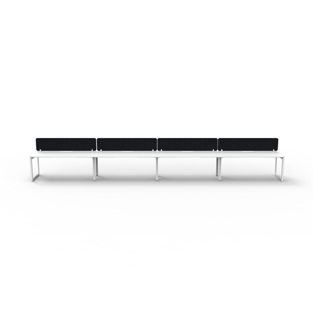 4 person single sided workstation with White top and White Satin frame, Black Eco screen.