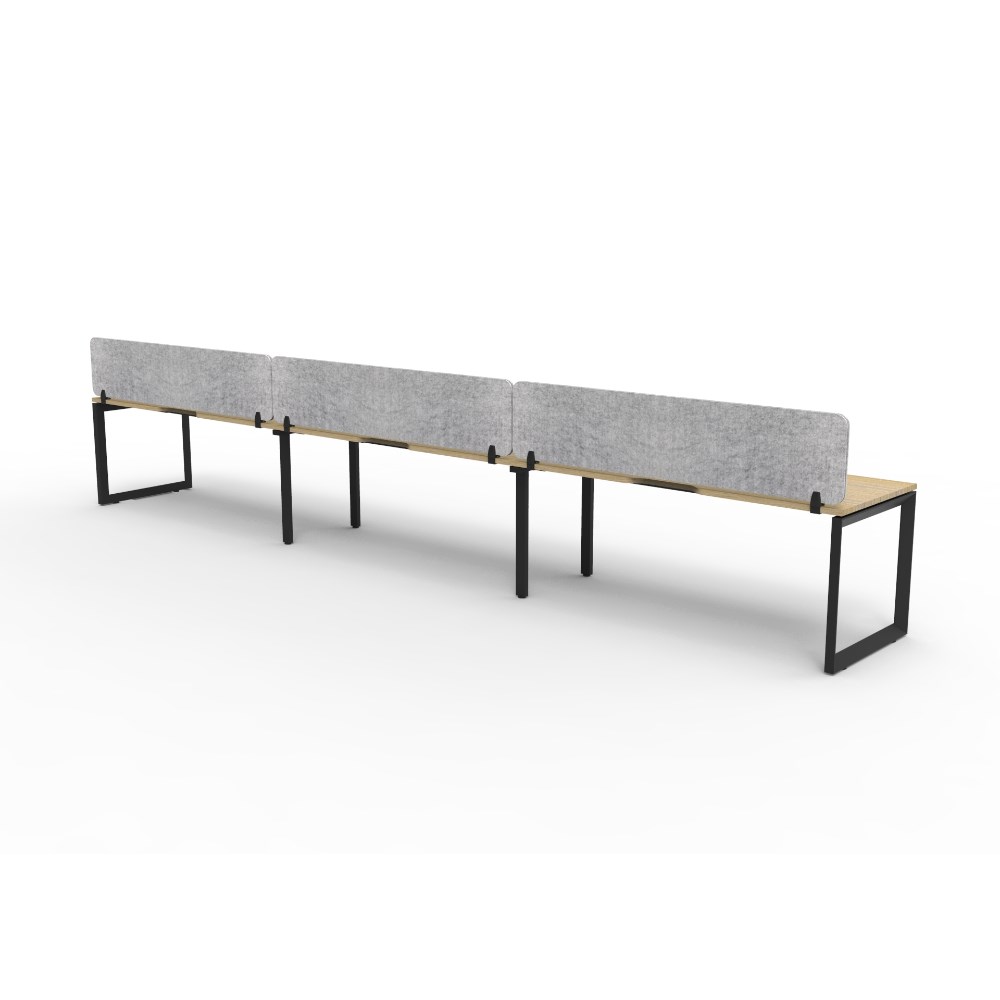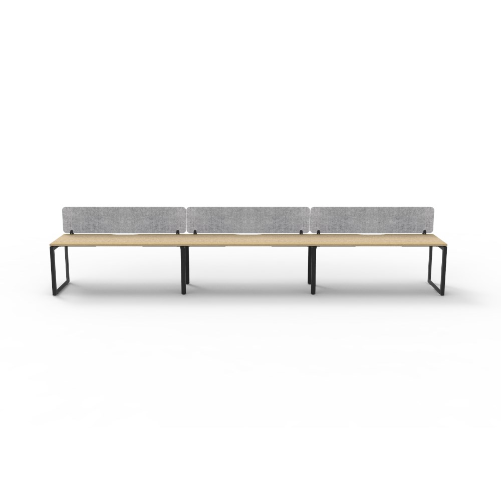 3 person single sided workstation with Natural Oak top and Black Satin frame, Grey Eco screen.