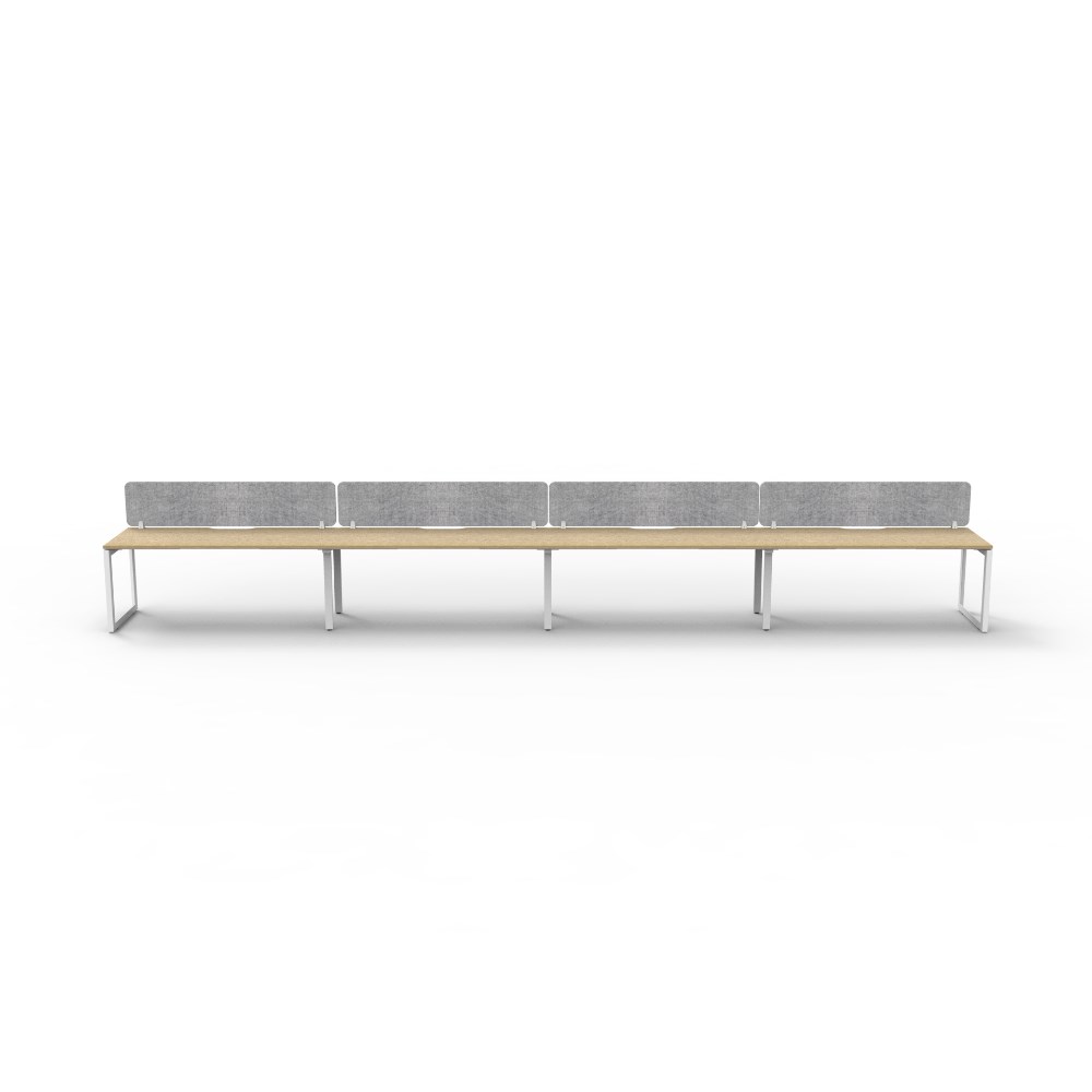 4 person single sided workstation with Natural Oak top and White Satin frame, Grey Eco screen.
