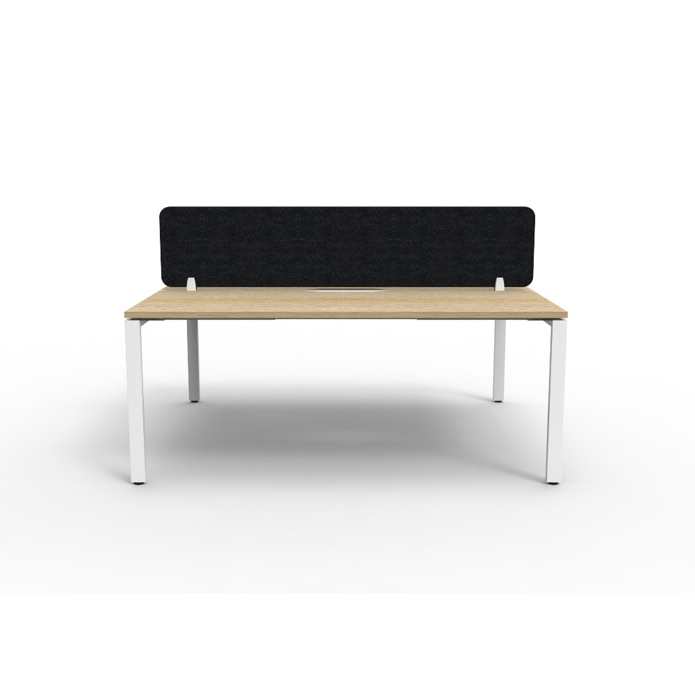2 person double sided workstation with Natural Oak top and White Satin frame, Black Eco screen.
