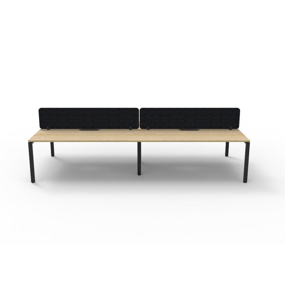 4 person double sided workstation with Natural Oak top and Black Satin frame, Black Eco screen.