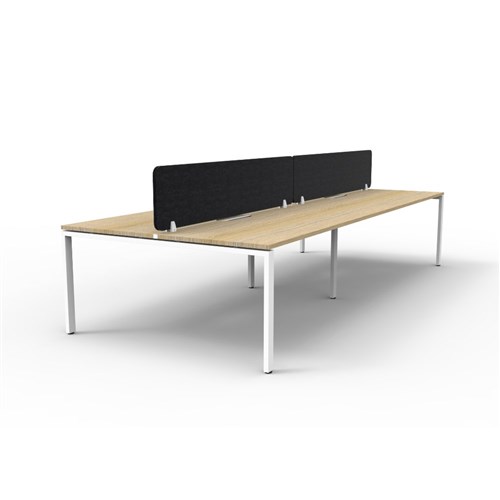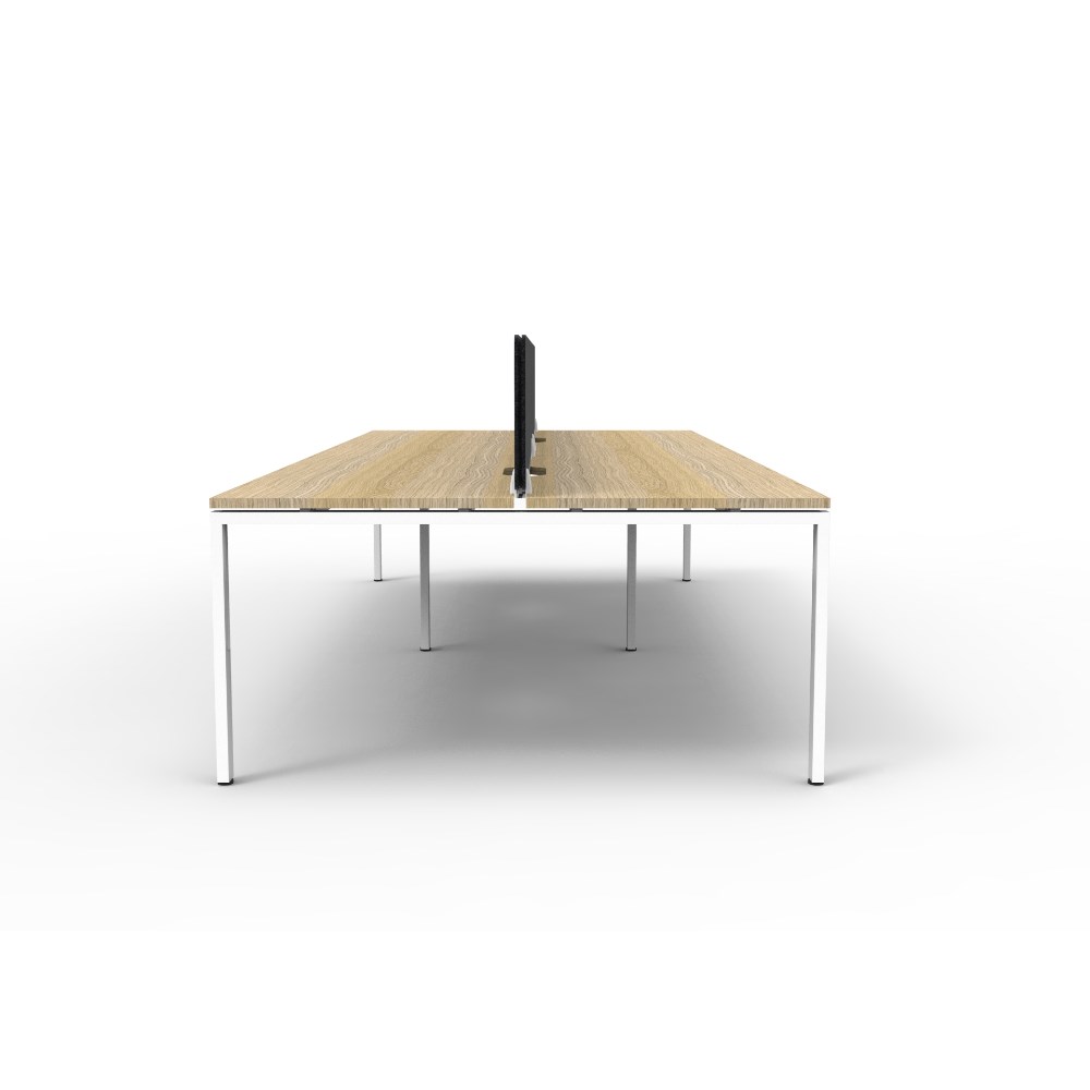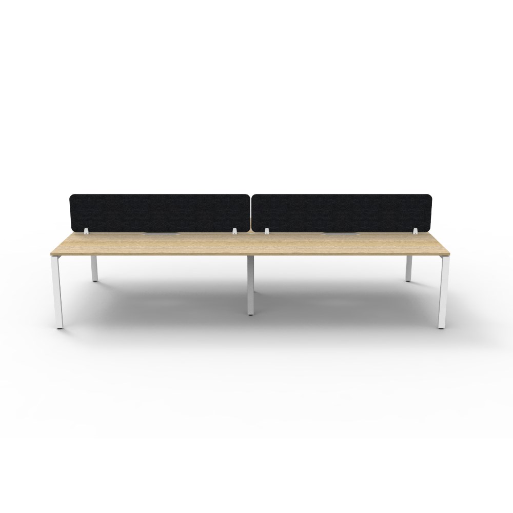 4 person double sided workstation with Natural Oak top and White Satin frame, Black Eco screen.