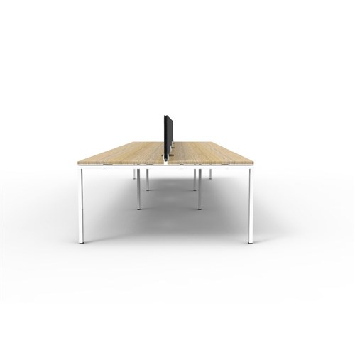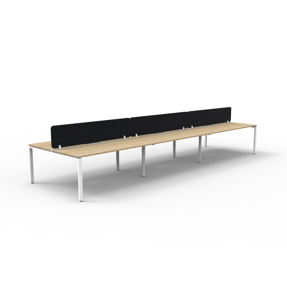 6 person double sided workstation with Natural Oak top and White Satin frame, Black Eco screen.