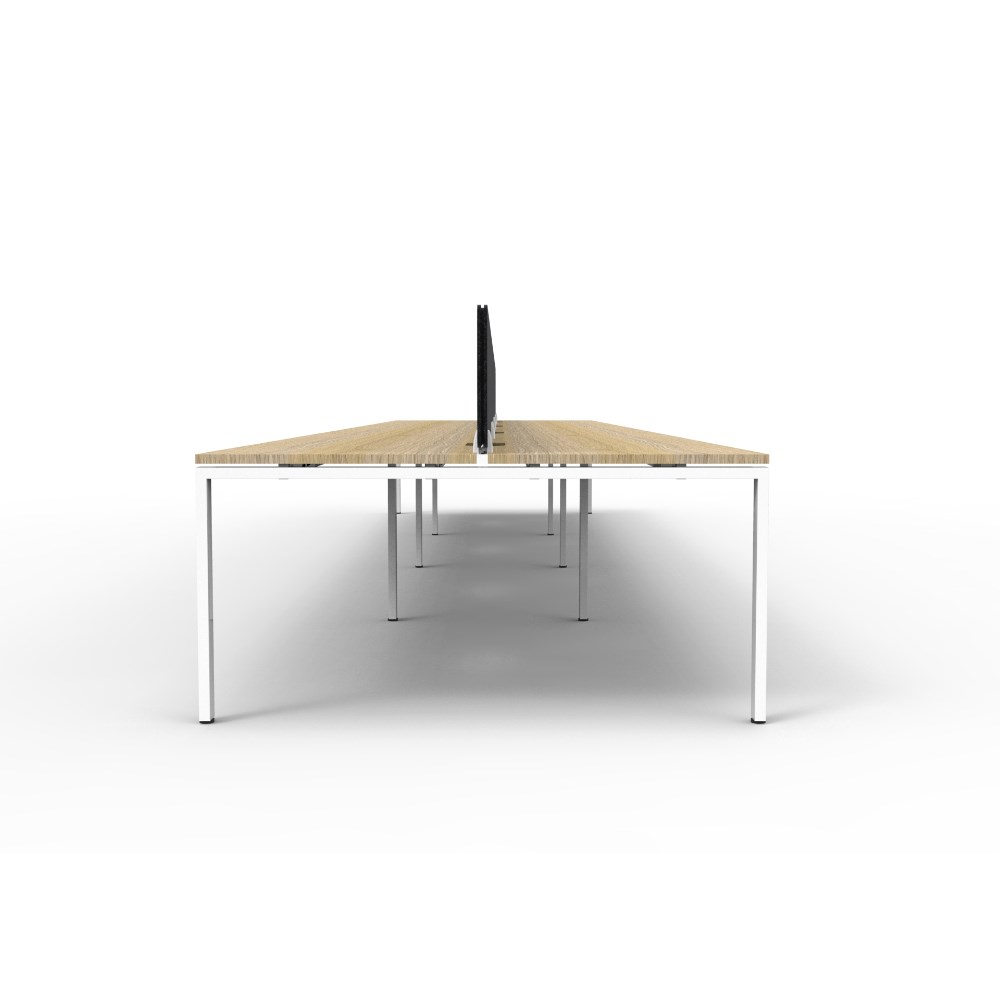 8 person double sided workstation with Natural Oak top and White Satin frame, Black Eco screen.