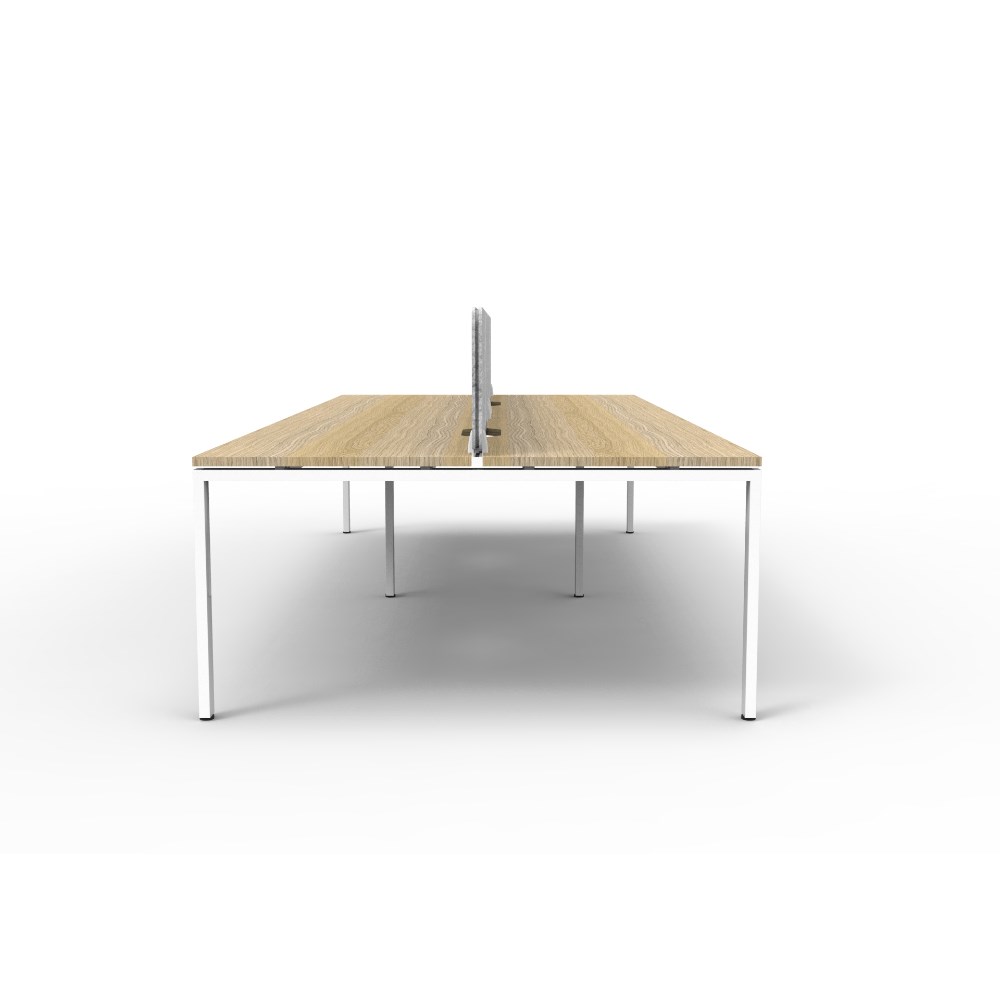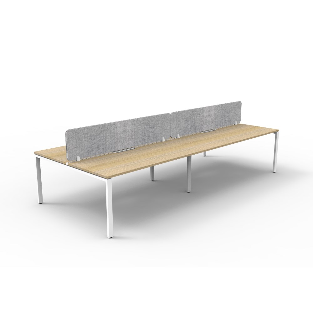 4 person double sided workstation with Natural Oak top and White Satin frame, Grey Eco screen.