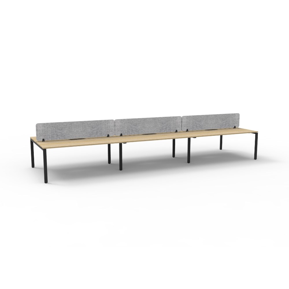 6 person double sided workstation with Natural Oak top and Black Satin frame, Grey Eco screen.