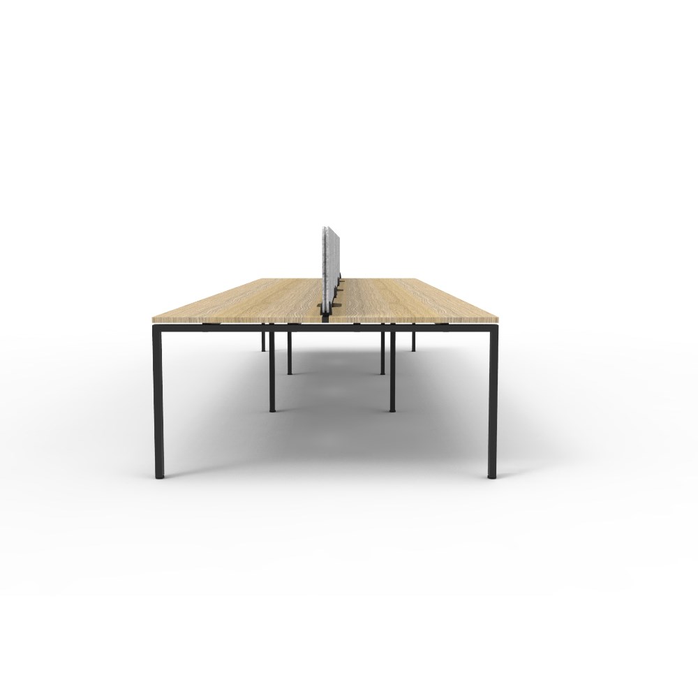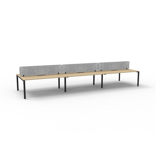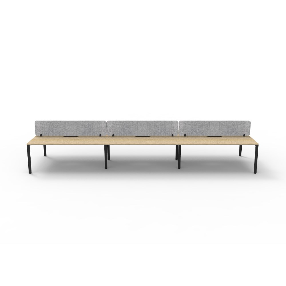 6 person double sided workstation with Natural Oak top and Black Satin frame, Grey Eco screen.