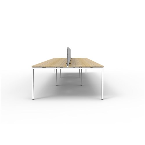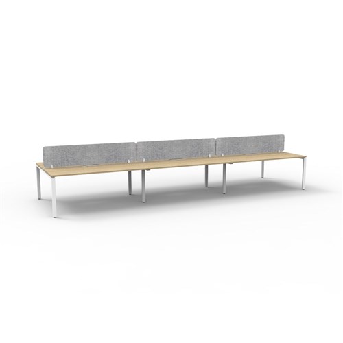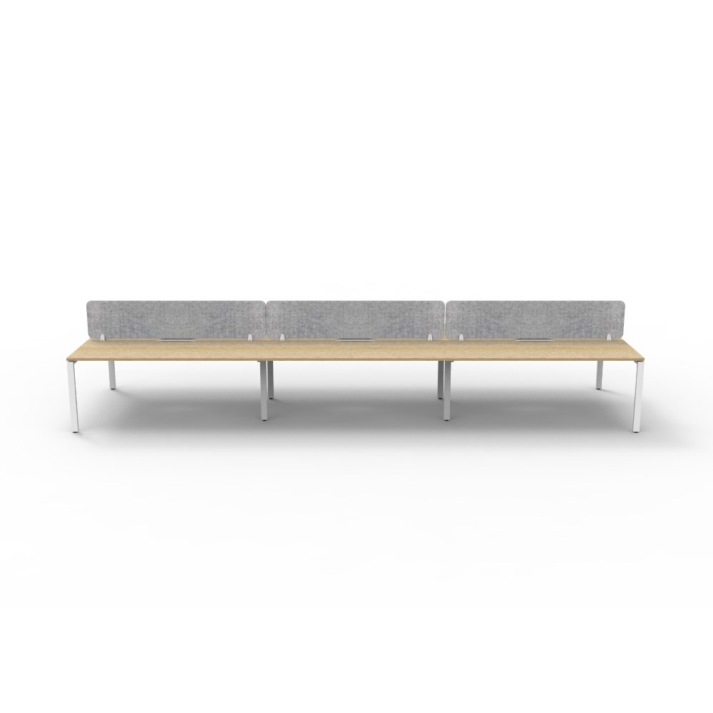 6 person double sided workstation with Natural Oak top and White Satin frame, Grey Eco screen.