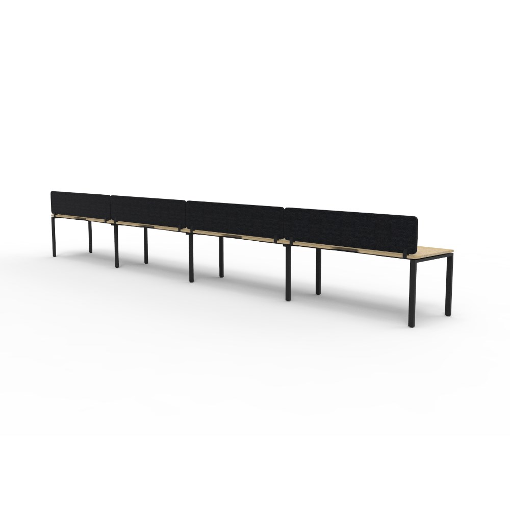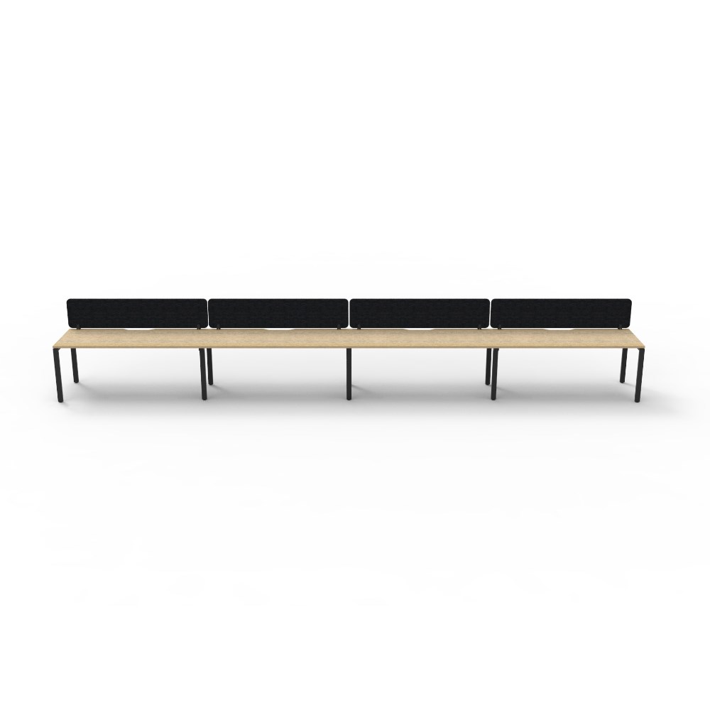 4 person single sided workstation with Natural Oak top and Black Satin frame, Black Eco screen.