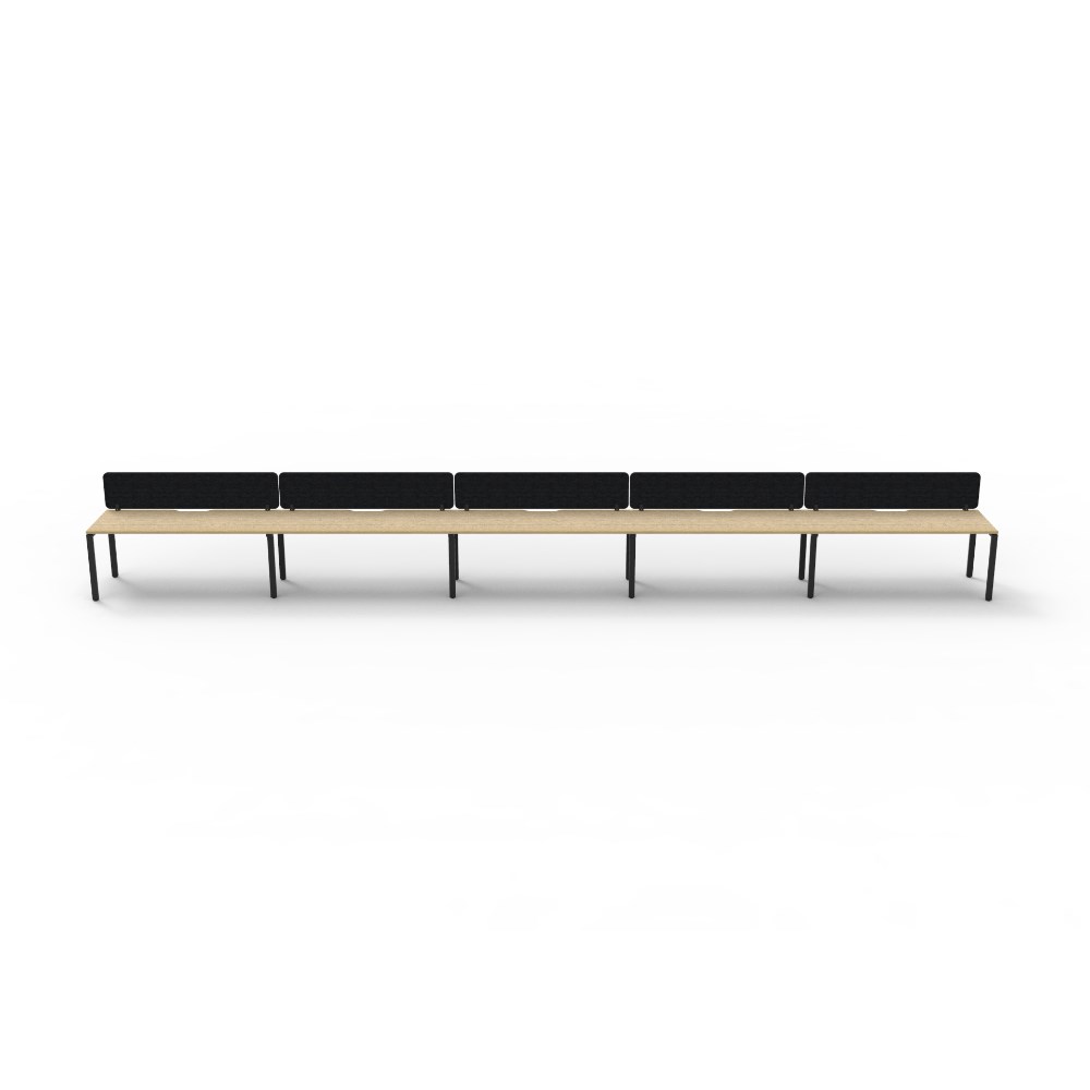 5 person single sided workstation with Natural Oak top and Black Satin frame, Black Eco screen.