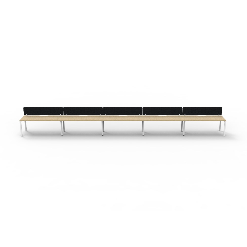 5 person single sided workstation with Natural Oak top and White Satin frame, Black Eco screen.
