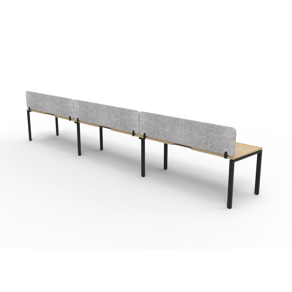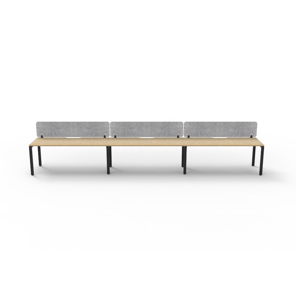 3 person single sided workstation with Natural Oak top and Black Satin frame, Grey Eco screen.