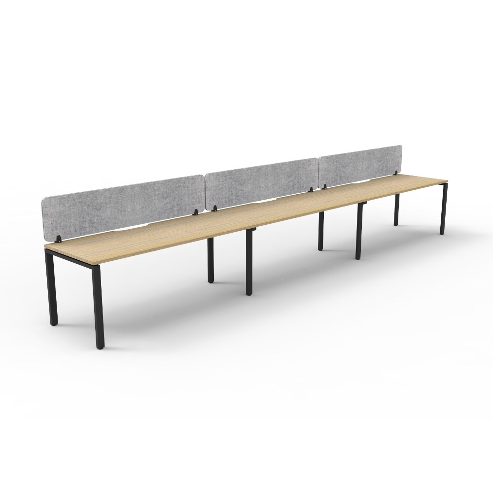 3 person single sided workstation with Natural Oak top and Black Satin frame, Grey Eco screen.