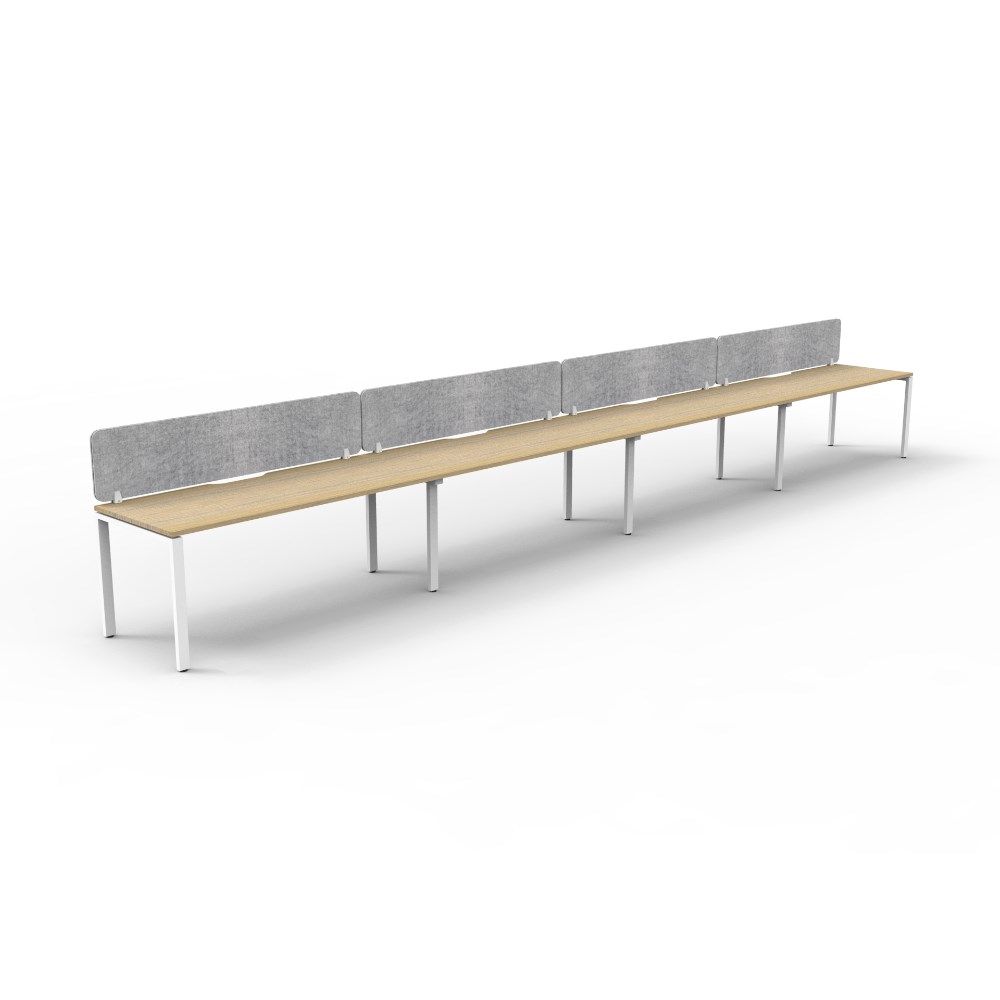 4 person single sided workstation with Natural Oak top and White Satin frame, Grey Eco screen.