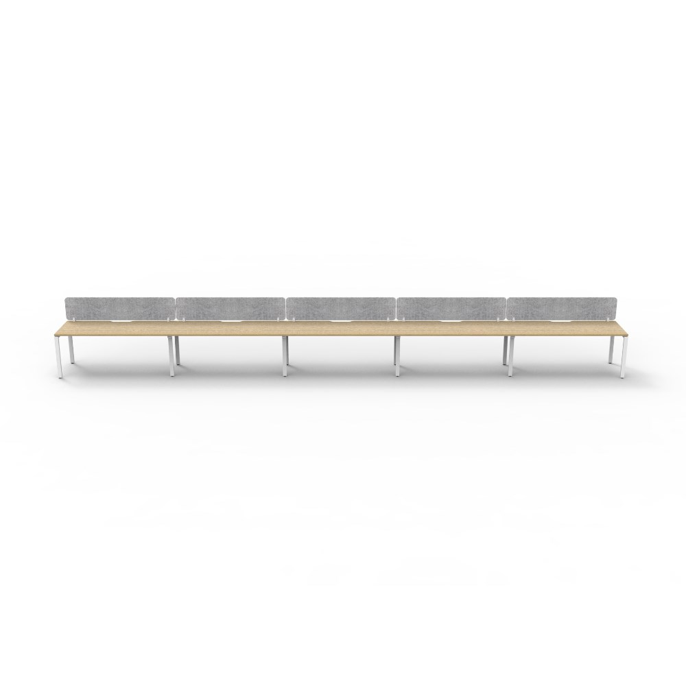 5 person single sided workstation with Natural Oak top and White Satin frame, Grey Eco screen.