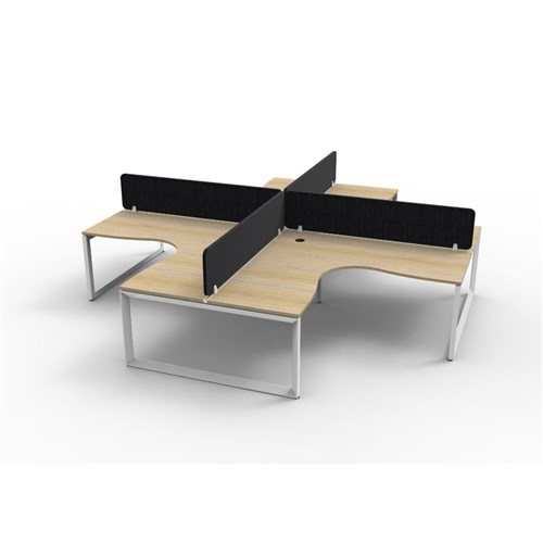 4 person corner workstation POD with Natural Oak top and White Satin frame, Black Eco screen.