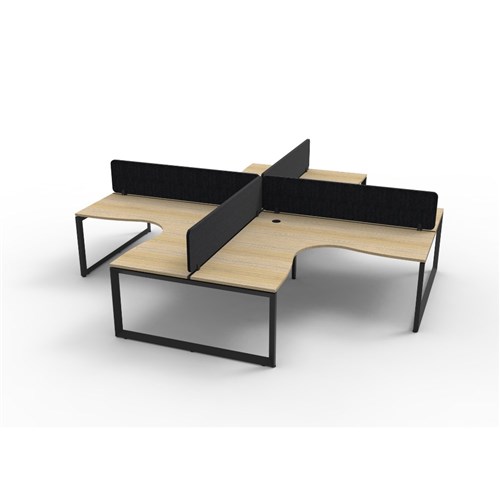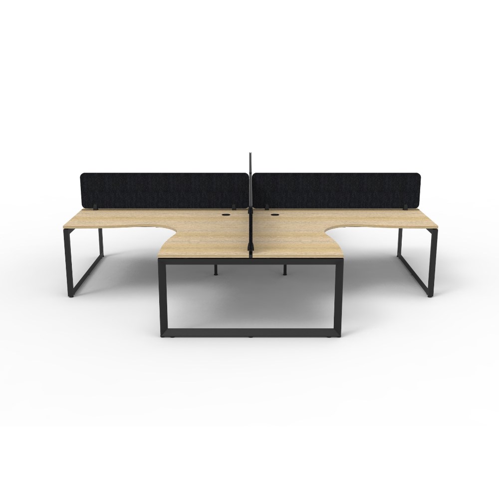 4 person corner workstation POD with Natural Oak top and Black Satin frame, Black Eco screen.
