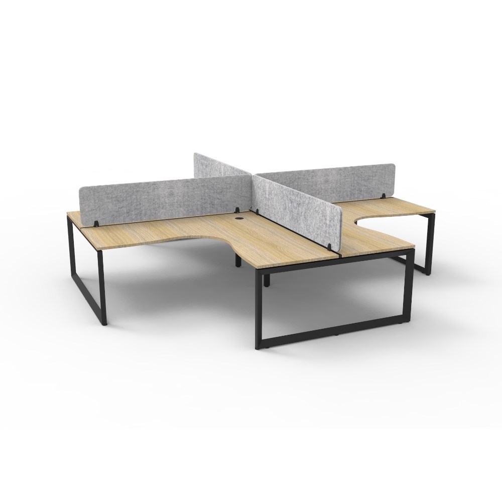 4 person corner workstation POD with Natural Oak top and Black Satin frame, Grey Eco screen.