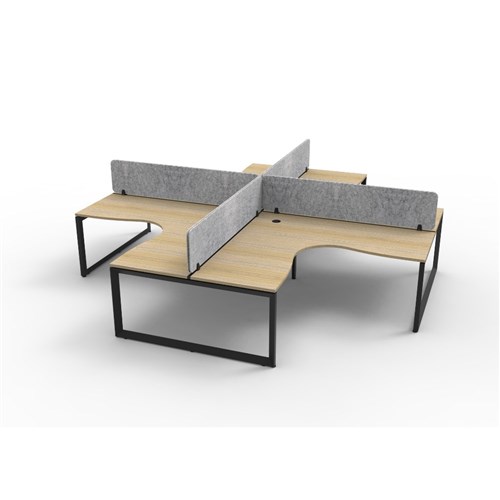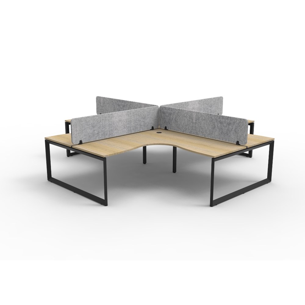 4 person corner workstation POD with Natural Oak top and Black Satin frame, Grey Eco screen.