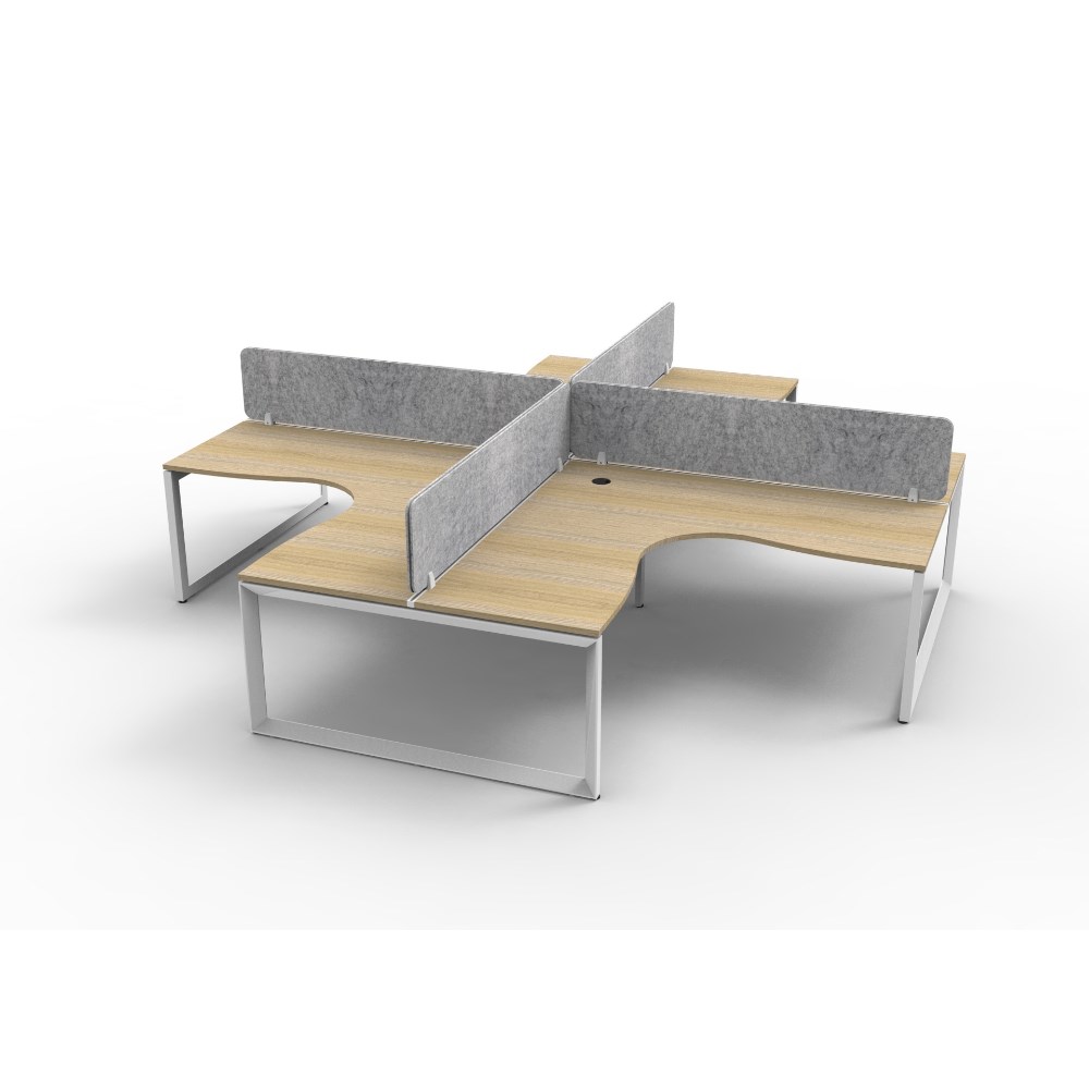 4 person corner workstation POD with Natural Oak top and White Satin frame, Grey Eco screen.