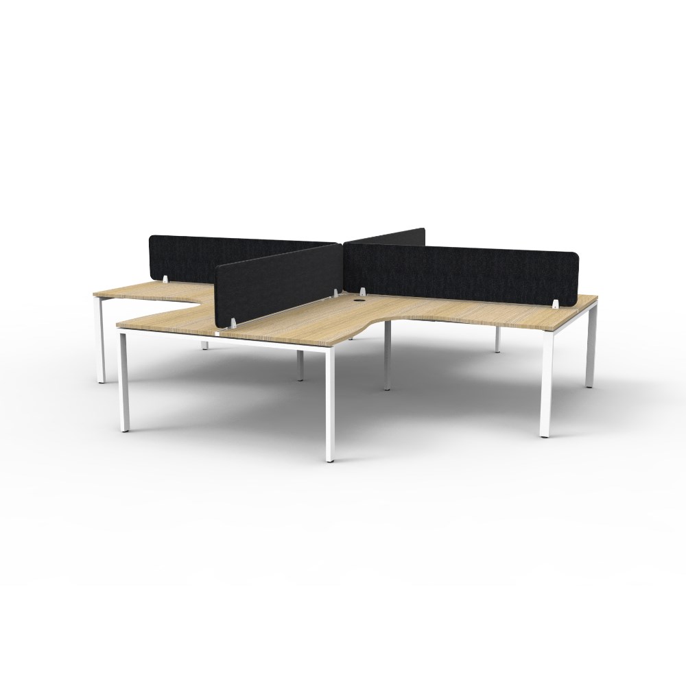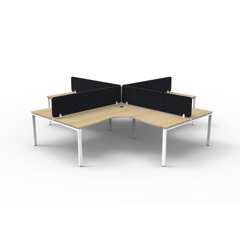 4 person corner workstation POD with Natural Oak top and White Satin frame, Black Eco screen.