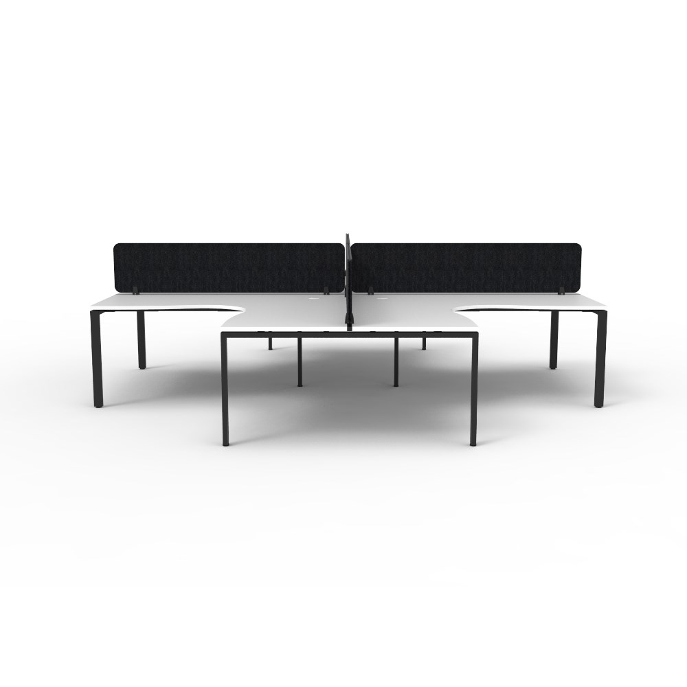4 person corner workstation POD with White top and Black Satin frame, Black Eco screen.