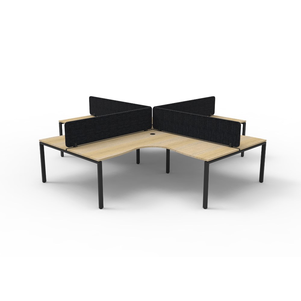 4 person corner workstation POD with Natural Oak top and Black Satin frame, Black Eco screen.