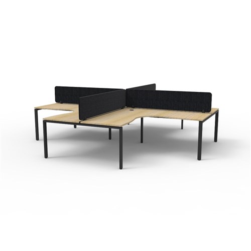 4 person corner workstation POD with Natural Oak top and Black Satin frame, Black Eco screen.
