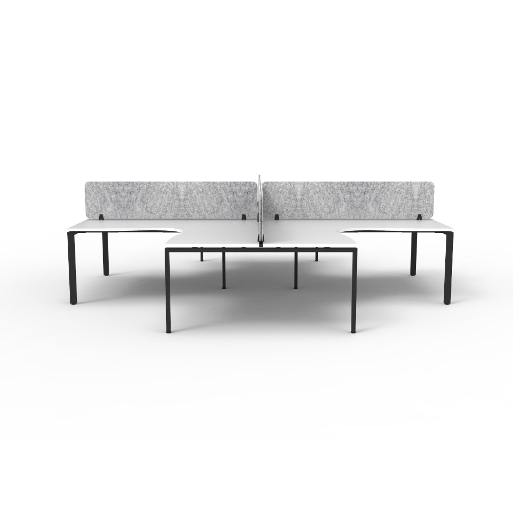 4 person corner workstation POD with White top and Black Satin frame, Grey Eco screen.