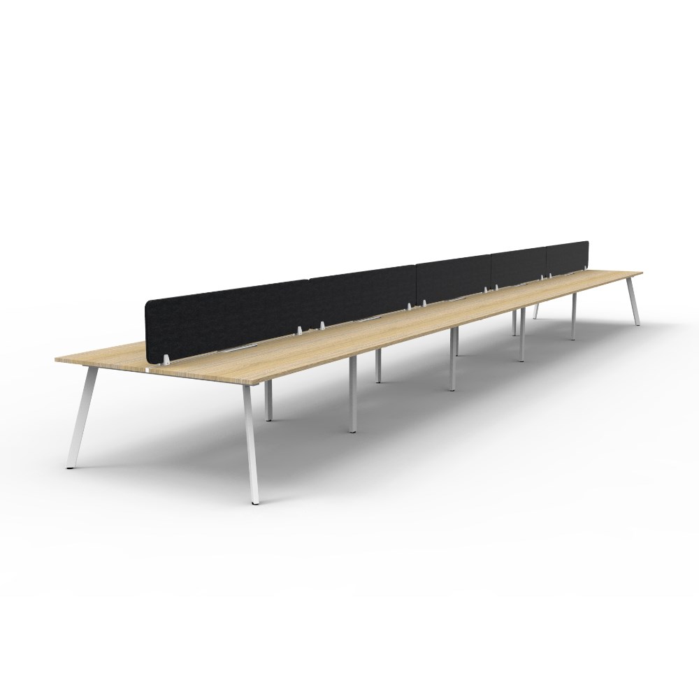 10 person double sided workstation with Natural Oak top and White Satin frame, Black Eco screen.