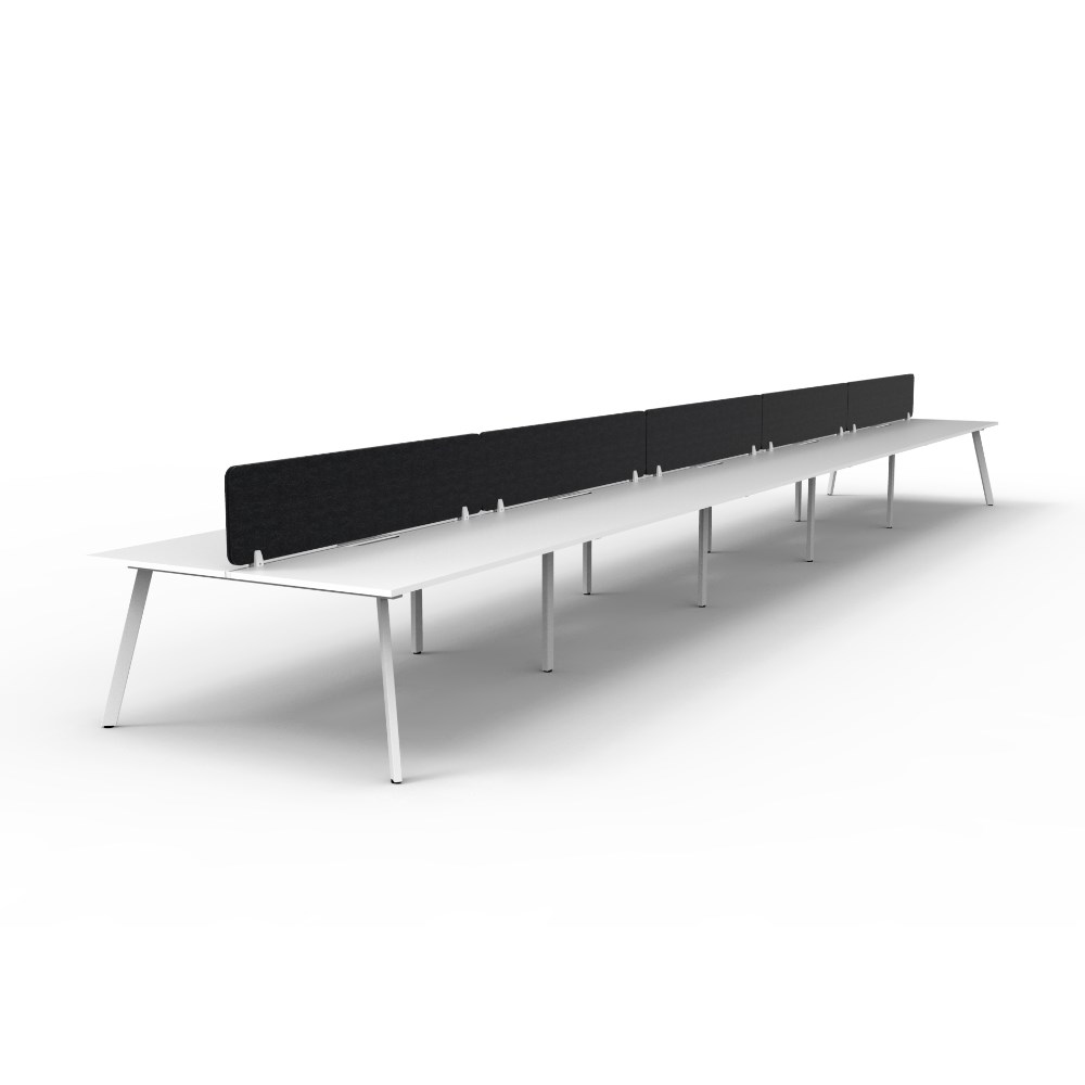 10 person double sided workstation with Natural White top and White Satin frame, Black Eco screen.