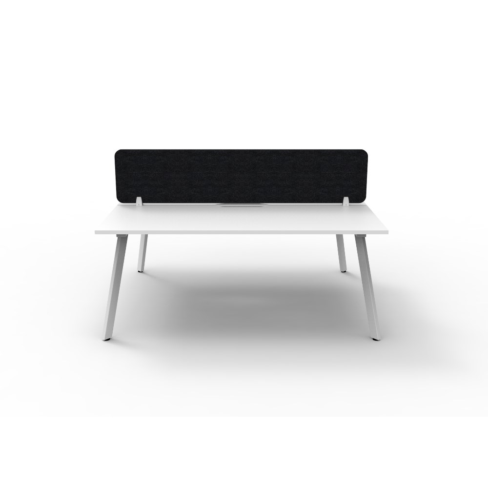 2 person double sided workstation with Natural White top and White Satin frame, Black Eco screen.
