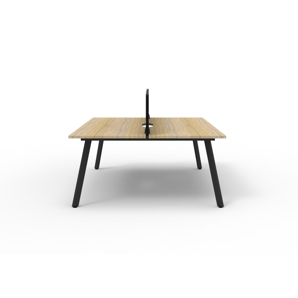 2 person double sided workstation with Natural Oak top and Black Satin frame, Black Eco screen.