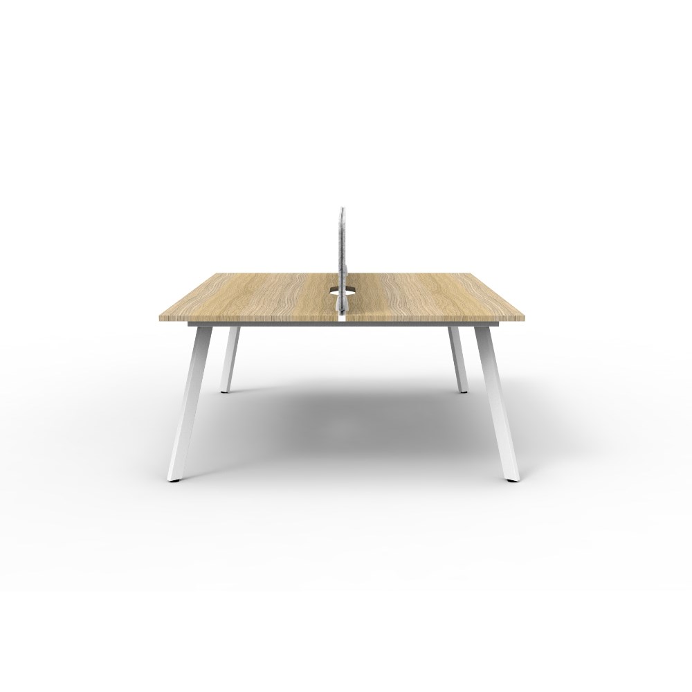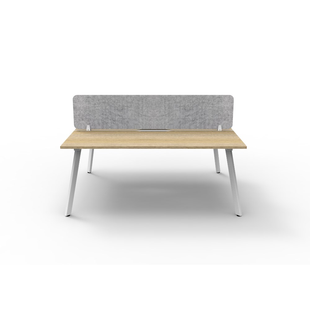 2 person double sided workstation with Natural Oak top and White Satin frame, Grey Eco screen.