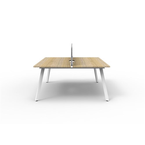 2 person double sided workstation with Natural Oak top and White Satin frame, Grey Eco screen.