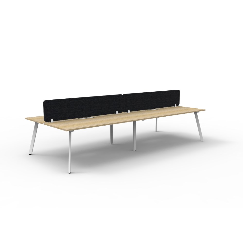 4 person double sided workstation with Natural Oak top and White Satin frame, Black Eco screen.