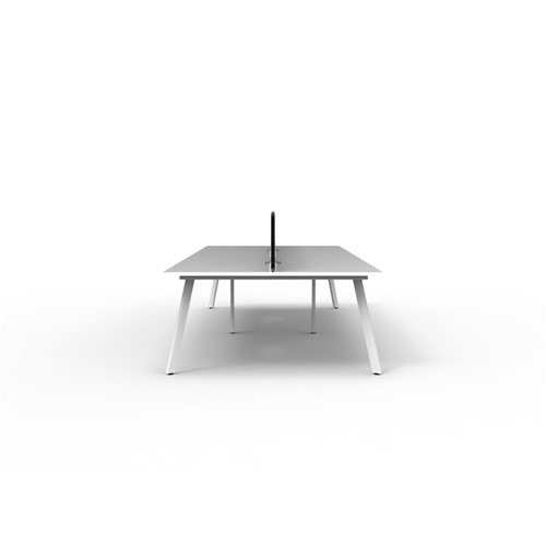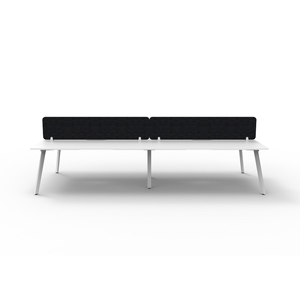 4 person double sided workstation with Natural White top and White Satin frame, Black Eco screen.