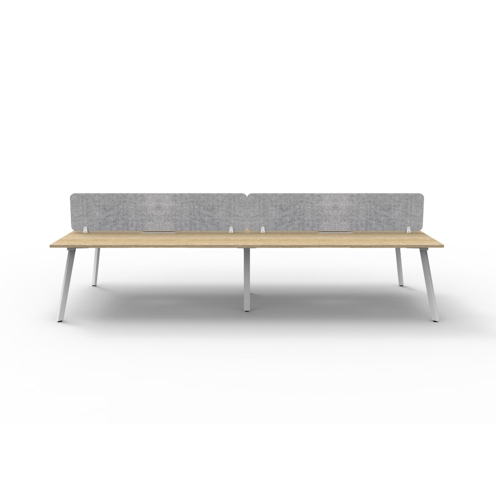 4 person double sided workstation with Natural Oak top and White Satin frame, Grey Eco screen.