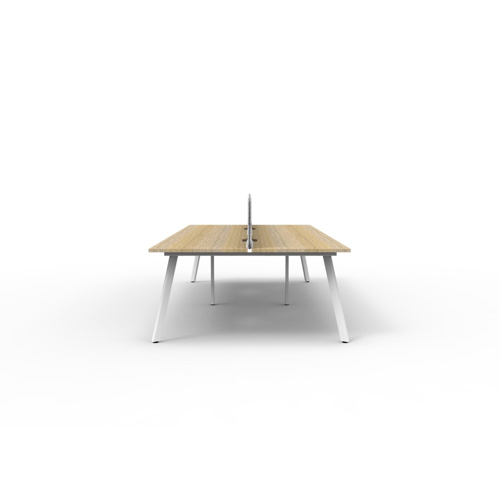 4 person double sided workstation with Natural Oak top and White Satin frame, Grey Eco screen.