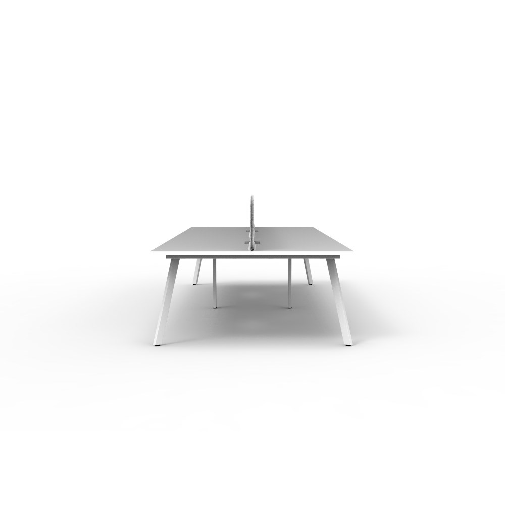 4 person double sided workstation with Natural White top and White Satin frame, Grey Eco screen.