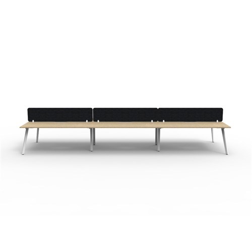 6 person double sided workstation with Natural Oak top and White Satin frame, Black Eco screen.
