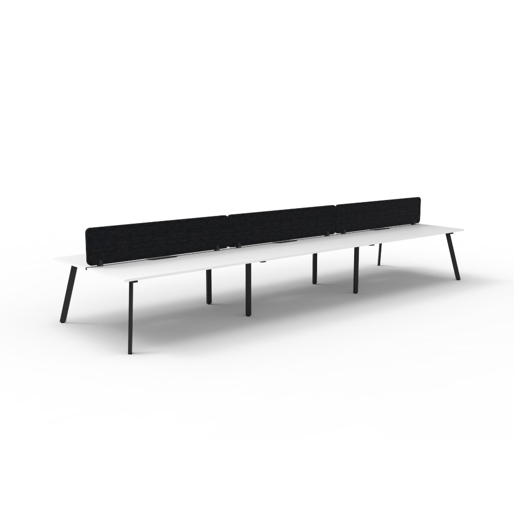 6 person double sided workstation with Natural White top and Black Satin frame, Black Eco screen.