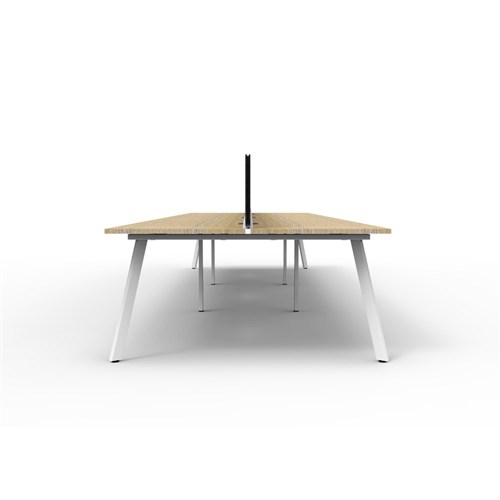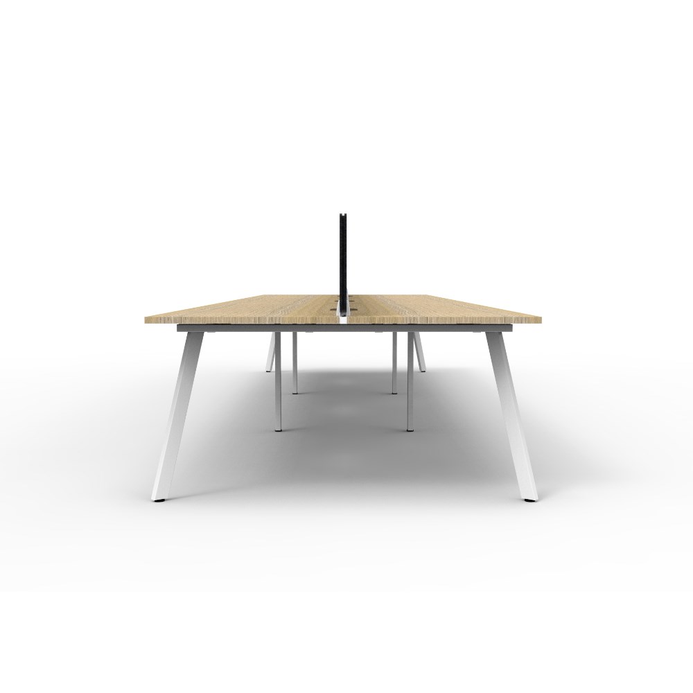 6 person double sided workstation with Natural Oak top and White Satin frame, Black Eco screen.